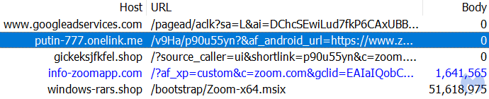The threat actors are using tracking templates to cloak the redirection mechanism to either the legitimate Zoom website or a site or their choosing. They are abusing a service called AppsFlyer (onelink.me) and HYROS (l.hyros.com) for their redirects. We observed the following links for the Zoom campaigns: