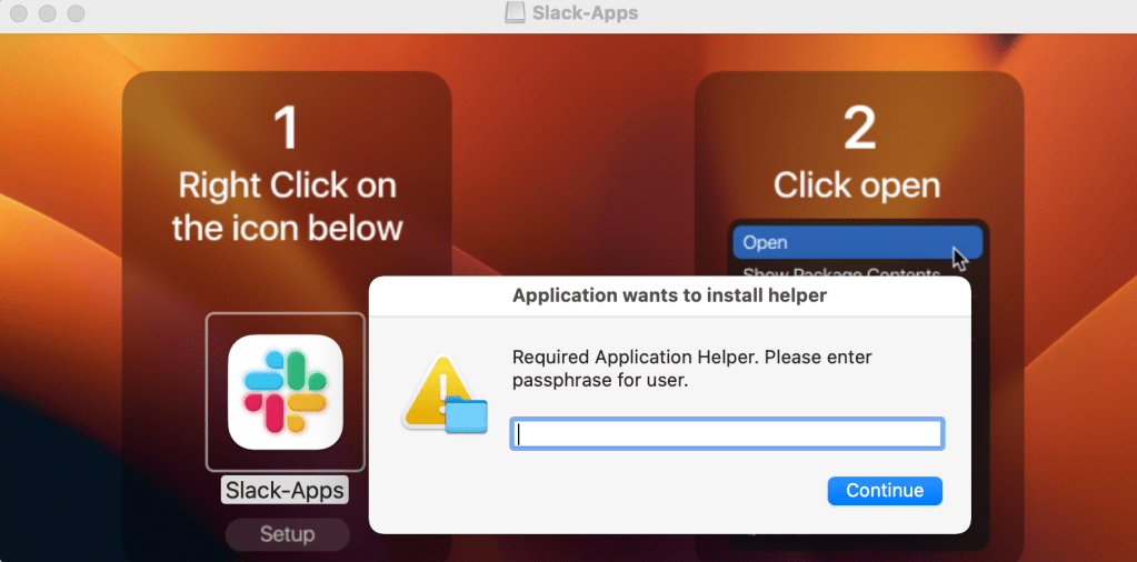 The malicious DMG file contains instructions for users to open the file as well as a dialog window asking them to enter their system password. This will allow Atomic Stealer to collect passwords and other sensitive files that are typically access-restricted.